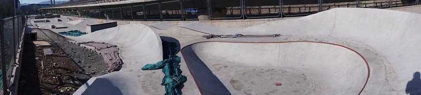 碗池區位于滑板公園的西側,主要由兩個碗池組成,結構如圖,近處的碗池由深淺兩部分組成,形成了一個Waterfall,深處附加了兩處Extension(延伸區),有明顯的Vert(垂面)部分。